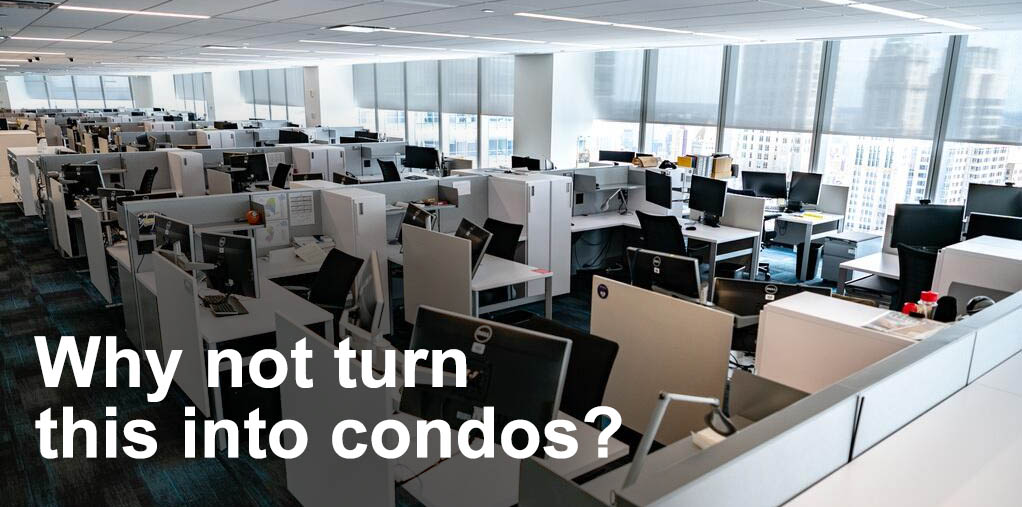At the same time, housing has gotten tighter and more expensive in those cities. A person might wonder why they don’t simply convert those empty office buildings into condos…solve two problems at once! It turns out, there are several reasons: